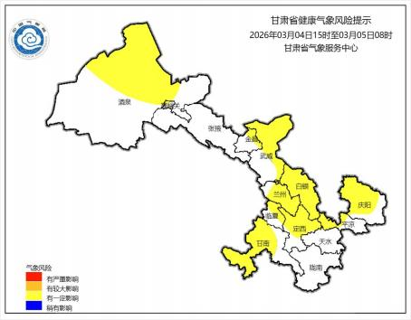 甘肃省气象服务中心、甘肃省疾控中心 2026年03月04日15时发布甘肃省健康气象风险提示:受大风沙尘天气影响,预计03月04 日15时至03月05 日08时,我省兰州、白银、定西(除岷县)、甘南(除舟曲)、临夏(除积石山)、酒泉(除阿克塞)、嘉峪关、金昌、武威、平凉(崆峒、庄浪、静宁)、庆阳(庆城、环县、华池、合水、镇原)大部分地方颗粒物浓度增多,对人体健康有一定影响。空气中颗粒物浓度增多,颗粒物会同吸附于其上的细菌、病毒和有害化学成分,刺激损伤呼吸道,引起鼻干、鼻塞、流涕、流泪、咽痛、咳嗽、咳痰等刺激症状与过敏反应,引发并加重呼吸道疾病,影响人体健康。大风沙尘期间提醒公众应尽量避免或减少外出,做好关窗除尘,外出时佩戴口罩。