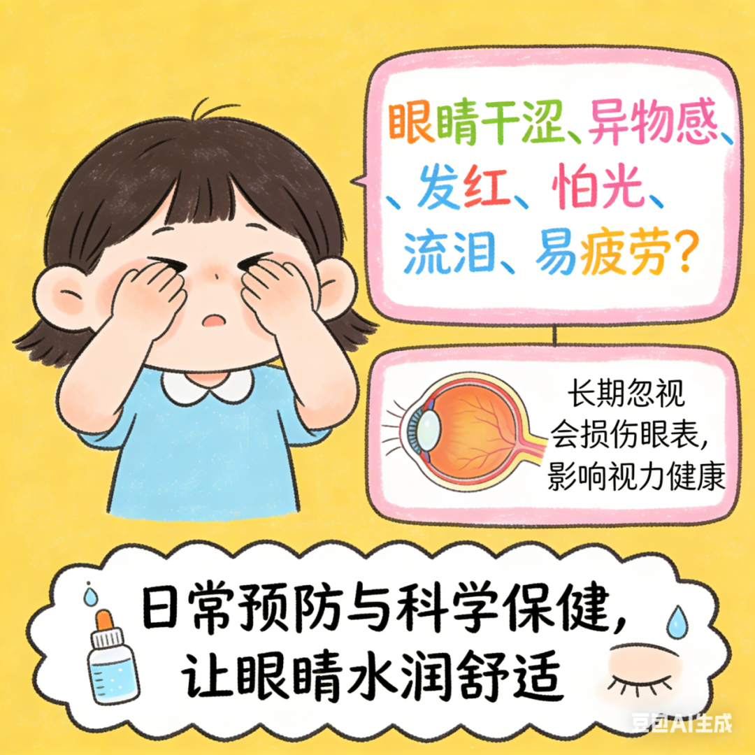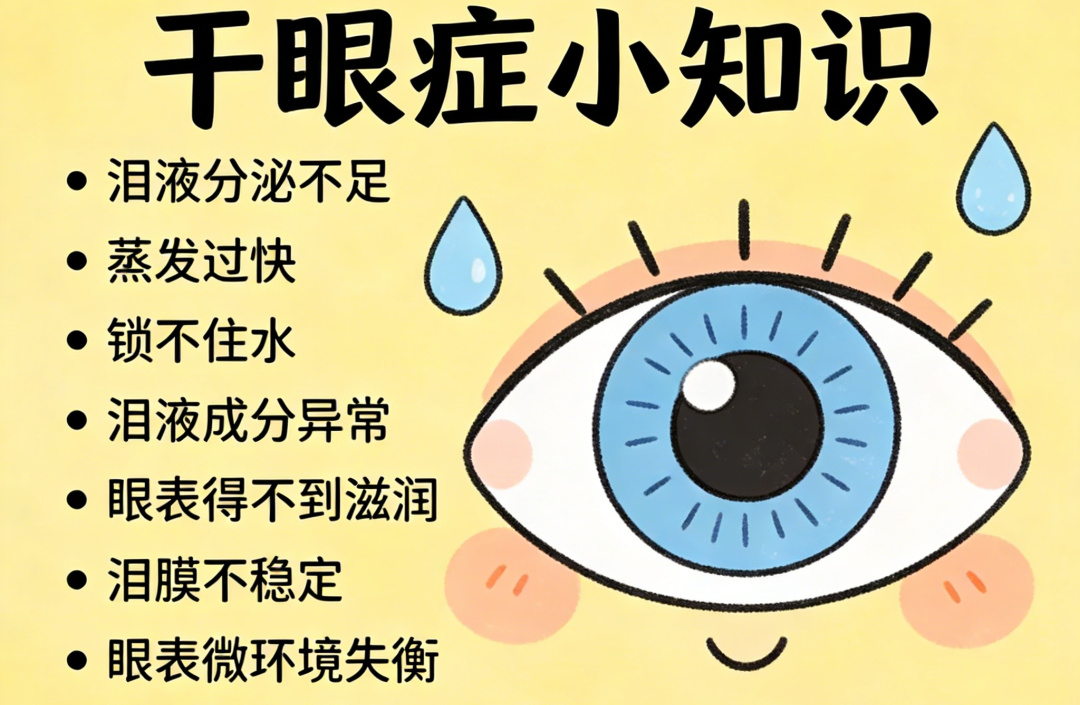 干眼症是泪液分泌不足、蒸发过快,锁不住水或泪液成分异常,导致眼表得不到充分滋润,泪膜不稳定或眼表微环境失衡,引发干涩、刺痛、视物模糊等不适的常见眼病。简单来说,就是眼睛的“保湿系统”出了问题,长期缺水、缺油,导致眼表黏膜受损。
