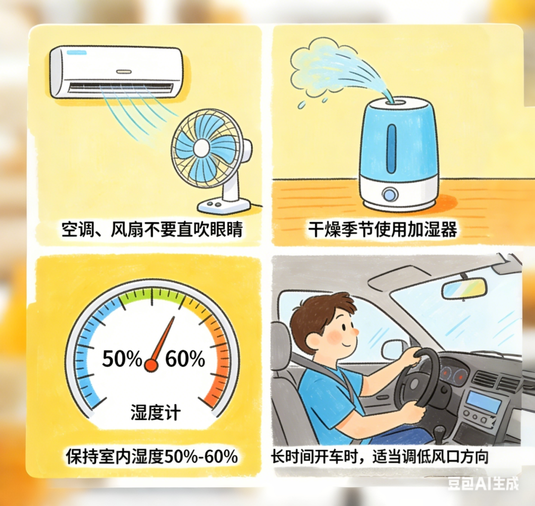 空调、风扇不要直吹眼睛,干燥季节使用加湿器,保持室内湿度在50%-60%,长时间开车时,适当调低风口方向。