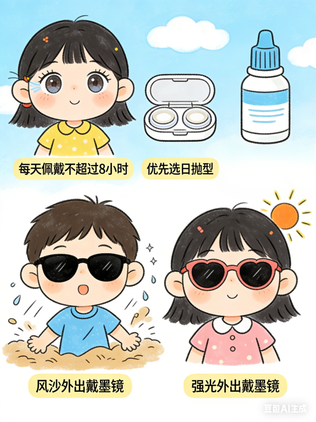 隐形眼镜/美瞳每天佩戴不超过8小时,优先选日抛型。不随意滴眼药水,含防腐剂、清凉刺激型的长期使用会加重干涩,风沙、强光外出戴墨镜,减少紫外线和异物刺激。