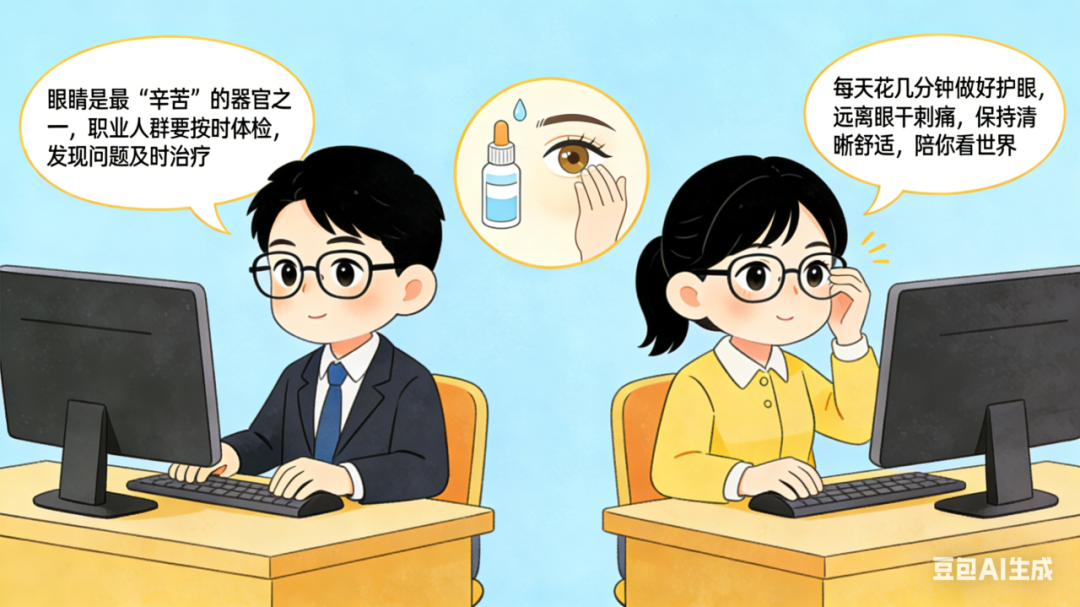 眼睛是最“辛苦”的器官之一,尤其职业人群,要按时体检,发现问题及时治疗,重在预防,别等到干涩、刺痛找上门才重视,每天花几分钟做好护眼,让眼睛远离“干旱”,才能一直保持清晰又舒适,才能陪你更久走遍天下看世界。
