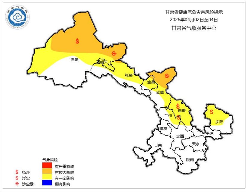 甘肃省气象服务中心、甘肃省疾控中心2026年04月01日16时30分发布甘肃省健康气象风险提示:预计04月02日至04日,我省酒泉(金塔)、武威(民勤)境内有沙尘暴,大气中颗粒物浓度高,对人体健康有较大影响;酒泉(瓜州、肃北、玉门、敦煌)、嘉峪关、张掖、金昌、武威(凉州区、古浪)、白银、兰州(兰州新区、皋兰、榆中)、庆阳(环县、华池、庆城)境内有扬沙或浮尘,对人体健康有一定影响。空气中颗粒物浓度增多,颗粒物会同吸附于其上的细菌、病毒和有害化学成分,刺激损伤呼吸道,引起鼻干、鼻塞、流涕、流泪、咽痛、咳嗽、咳痰等刺激症状与过敏反应,引发并加重呼吸道疾病,影响人体健康。大风沙尘期间提醒公众应尽量避免或减少外出,做好关窗除尘,外出时佩戴口罩。